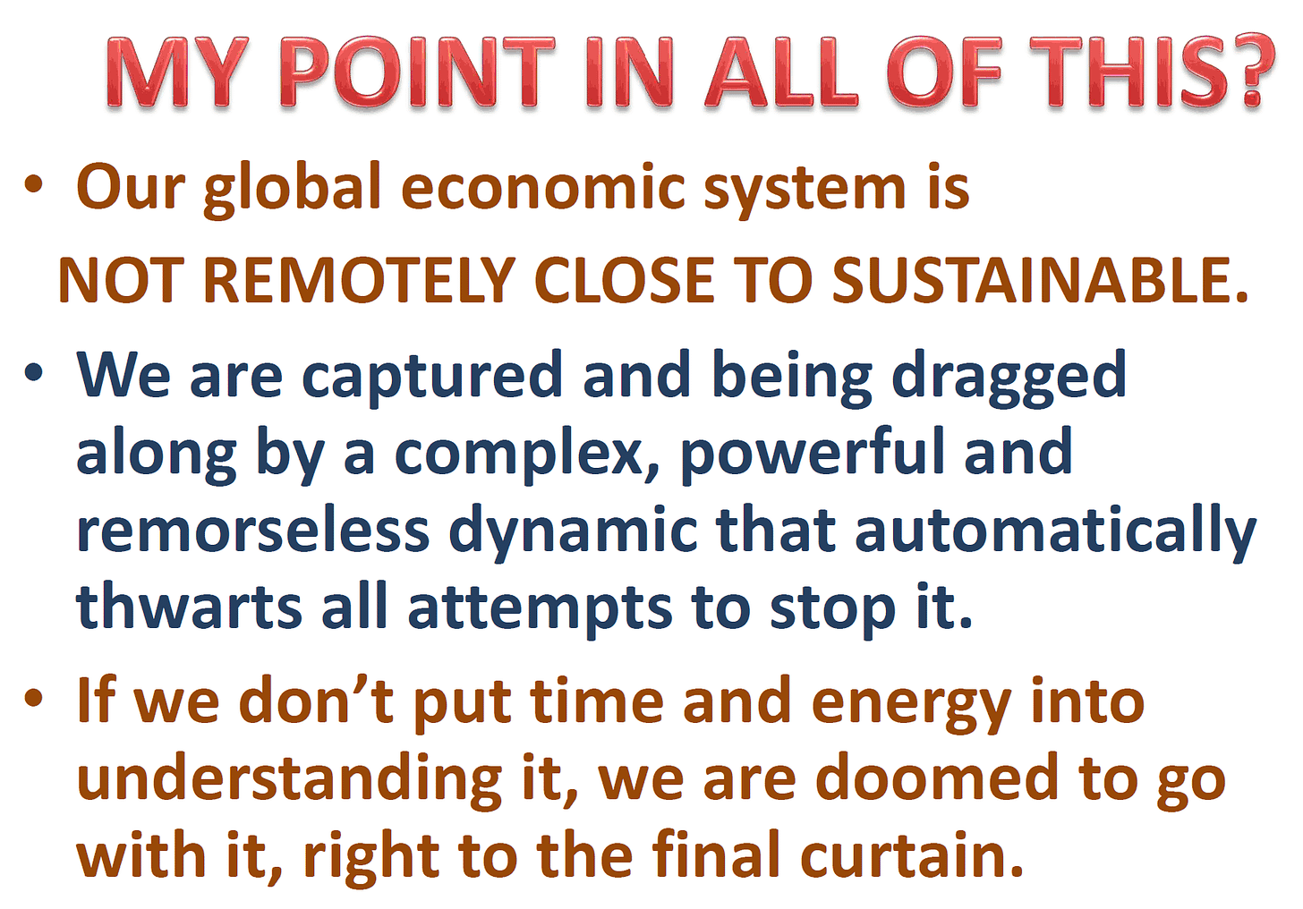 The basic proposition is ‘that continued industrialization and population growth will only lead to increased stresses… A growing inclination to face the problems of growth has appeared among engineers, businessmen, social scientists, and politicians. Seminars, panel discussions, and debates have proliferated on the future of economic growth. But questioning the present trends of economic growth is much easier than finding answers to the questions of when, how, and for whom economic growth should stop’. — Jay Forrester 1973. [Therefore by the 1990s most academics and intelligentsia pundits came to believe that The Limits to Growth/World Dynamics studies made predictions that had failed to materialize and so the concerns raised could be dismissed, ignored, marginalized, obfuscated, denied, and those who still have them could be vilified, demonized, and ridiculed as chicken littles with computers.]