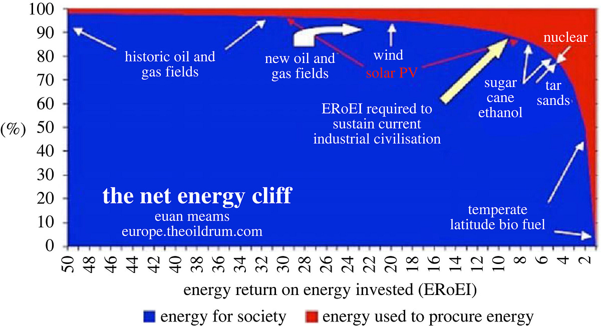 Figure 2. The ‘net energy cliff’. As EROI declines from high values to lower values, it makes little difference to society, as the net energy delivered does not change much. But below an EROI of 10 : 1 any declines make a large difference on the amount delivered (darker colour) (Courtesy of Euan Mearns).