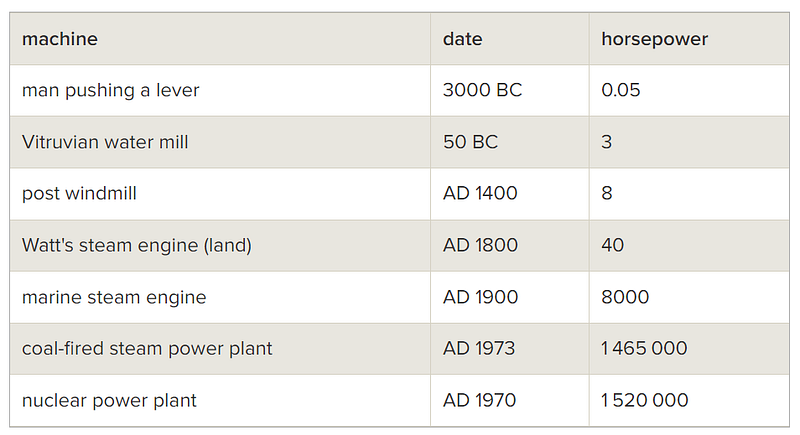 To carry this parallel further, the Russian Biophysicist Aleksandr Zotin writes that when human beings began to expend energy outside their bodies through the use of fire and machines, it enabled them to surpass the biological limits of their bodies and further maximize their ability to manifest power and produce entropy [27]. When we consider the different ways human beings have transformed energy outside their bodies historically, we can see that the thesis developed by Lenton et al. can be extended to the first three industrial revolutions. Above is a partial, chronological list of the advancements in heat engine technology provided by Earl Cook (table 1) [37].