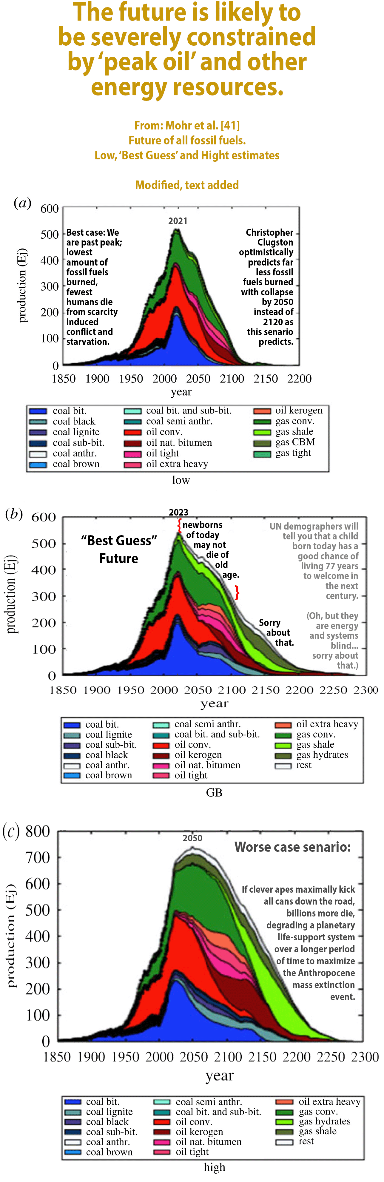 Figure 1. Past production of fossil fuels and three projections of future availability: (a) Low estimate (b) best-guess, and © high (maximum) estimate [42]. Similar estimates are available from Maggio and Cacciola [43] and Laherrere et al. [44]. All three estimates show a peak of all fossil fuels within at most the next 10–35 years.