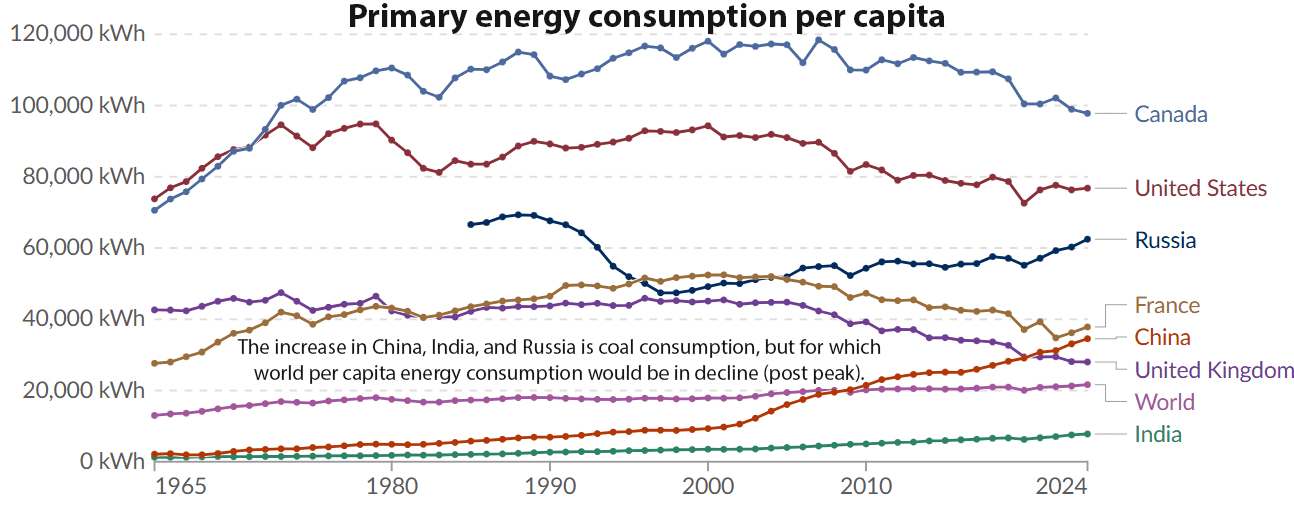 But from the point of view of consumers, of denizens of the monetary culture, what will feel like peak everything will be a noticeable decline in GDP. In 2023 peak GDP hit $20,671 per capita with 2024 showing a 2.8% increase ($20,729/capita). This is looking like business as usual, and not peak everything, hence belief in Growth Everlasting continues (if you don’t want to know what GDP is a measure of —don’t think about energy).