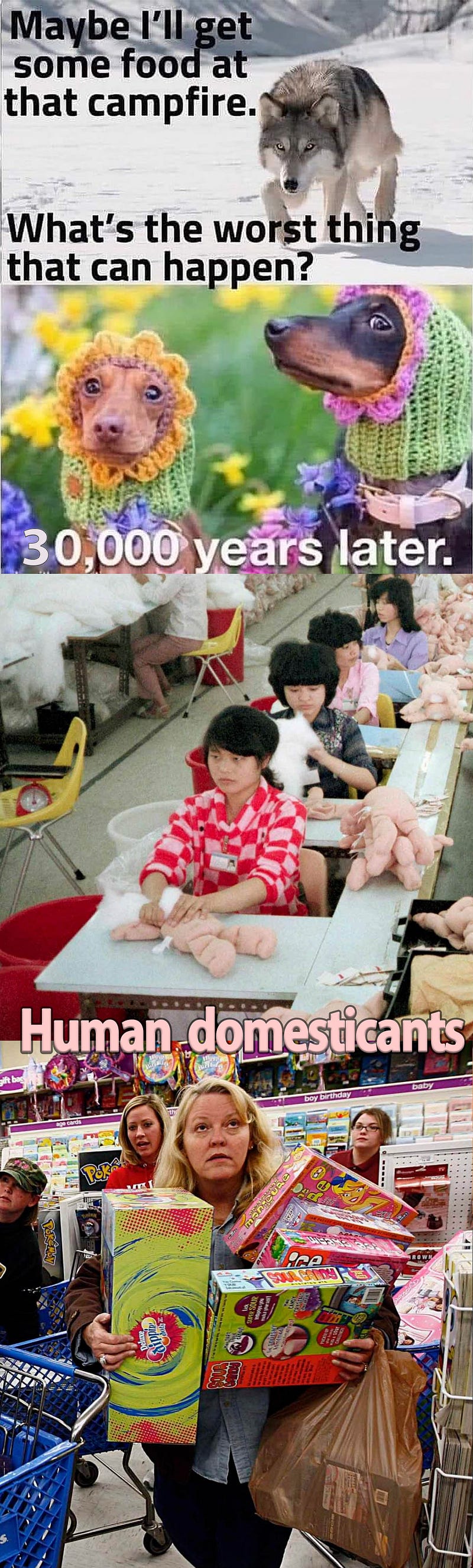 The expansionist enterprise was dependent on ideology and technology — on serving both. The condition of dependency selects for domestication. Wolves who became dependent on humans became dogs, wolf domesticants. Humans whose persistence was dependent on technology and ideology became modern human domisticants who added money to what they depend on and serve.