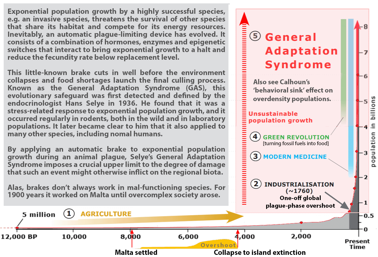 A response to stress is still evident (e.g. increased diseases of civilization including mental illness and the ‘demo graphic transition’, which is an observation, not a theory, that may be secondary to stress on modern women who are increasingly educated to serve the economy apart from home to pay for daycare if any children happen for some inconvenient reason). The GAS response, however, is not adaptive enough to have prevented overshoot: