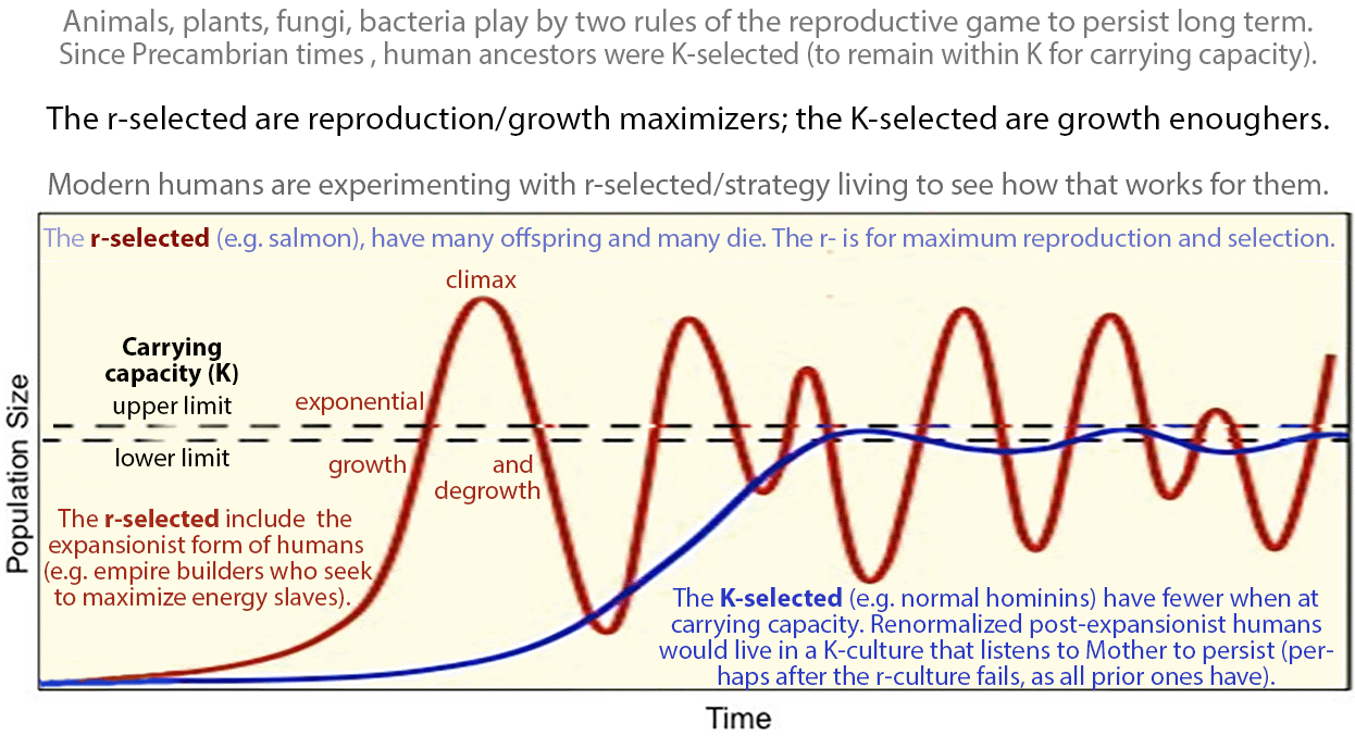 Other traits associated with r-selected and K-selected species are a distraction. The belief that modern humans are K-selected is a necessary illusion — as if modern humans were recognized to be r-selected, their worldview based on zero-order humanism, on the ideology of the necessary primacy of the human enterprise, would be fatally contradicted (but better now than later).