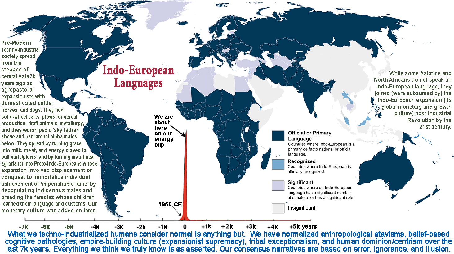 But in modern times no one Omniscient Conqueror has claimed the planet yet, so conflict between empire builders persists. While all land areas had been taken by the 18th century, the resources within had not. There was a planetary larder of fossil fuels for the taking, energy to empower the taking of all other nonrenewable natural resources, and it was the Indo-Europeans who first used coal to grow empire, empowering an Industrial Revolution that could turn fossil fuels into food via a Green Revolution even faster than the human, livestock, and pet populations could grow (until the 21st century) by turning 99% of vertebrate land animals into humans, livestock, and pets.
